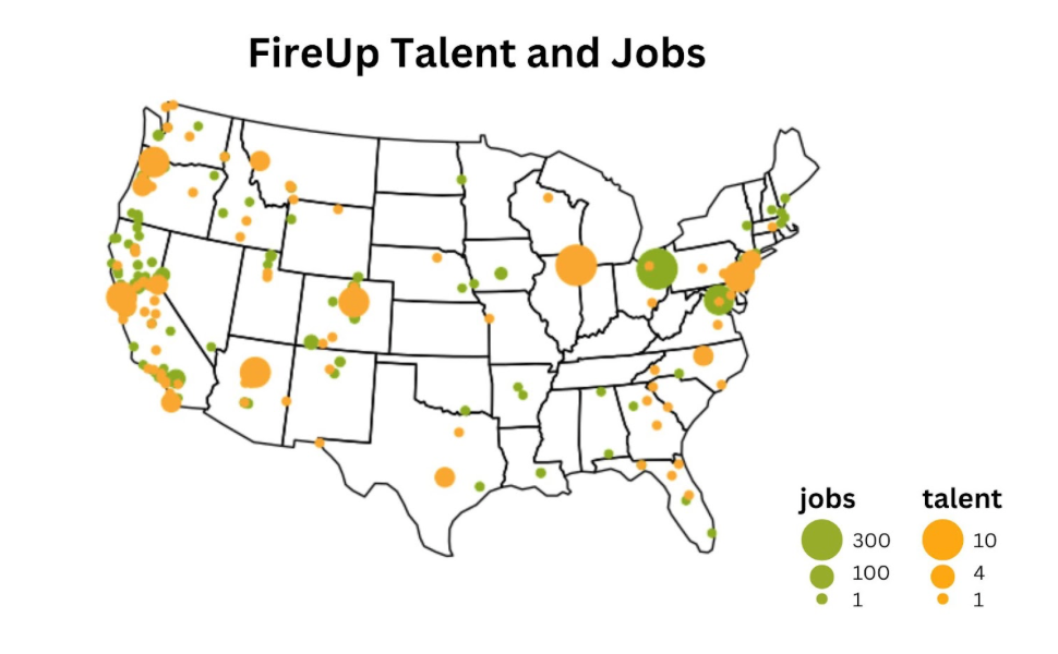 A majority of FireUp’s Talent Network has at least 2-5 years of prior work experience with transferable skills in project management, operations, administration, data science, marketing and communications. More than half our candidates have prior experience with the private sector, followed by experience with public agencies (especially federal agencies), educational institutions, conservation non-profits, environmental coalitions, and advocacy groups.