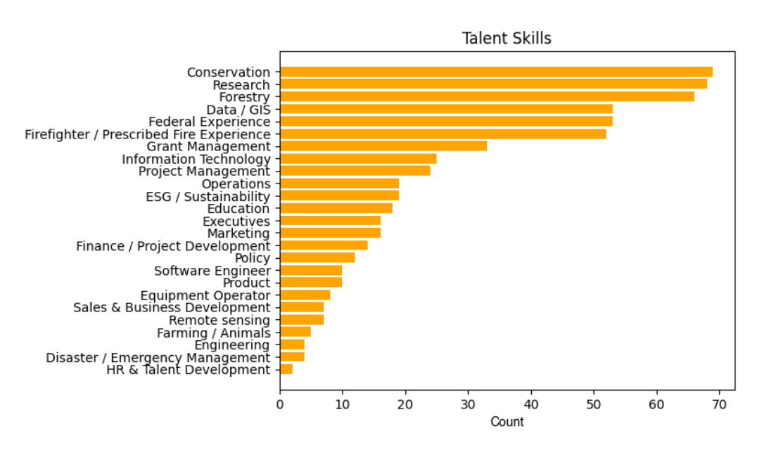 Our talent network’s past experience reflects a range of backgrounds, including in conservation, research, forestry, data/ GIS, firefighting, prescribed fire, sustainability, engineering, finance, and sales and business development.